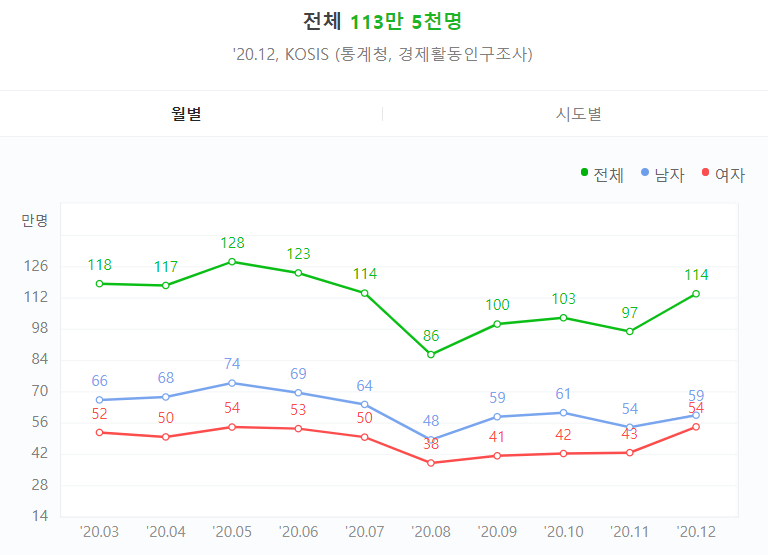 - 포스트 코로나 시대에 접어들며 실업자가 사상 처음 110만 명을 돌파하였다. 이는 전년대비 4만 5천 명이 증가한 수치이다.